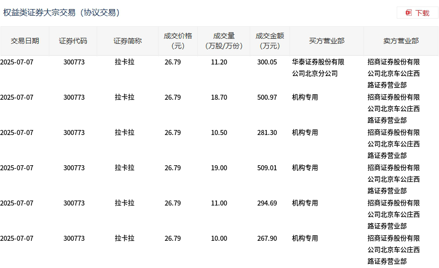 7月7日,拉卡拉大宗交易成交80.4万股,成交额2153.92万元,占当日总成交额的0.55%,成交价26.79元,较市场收盘价31.06元折价13.75%。