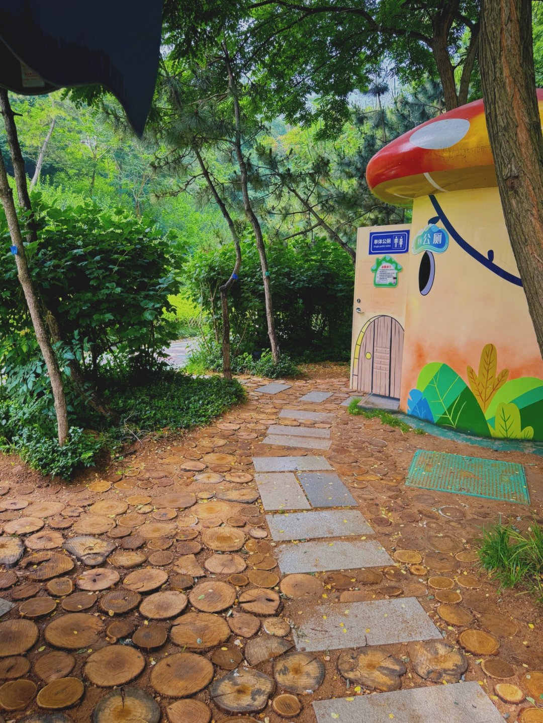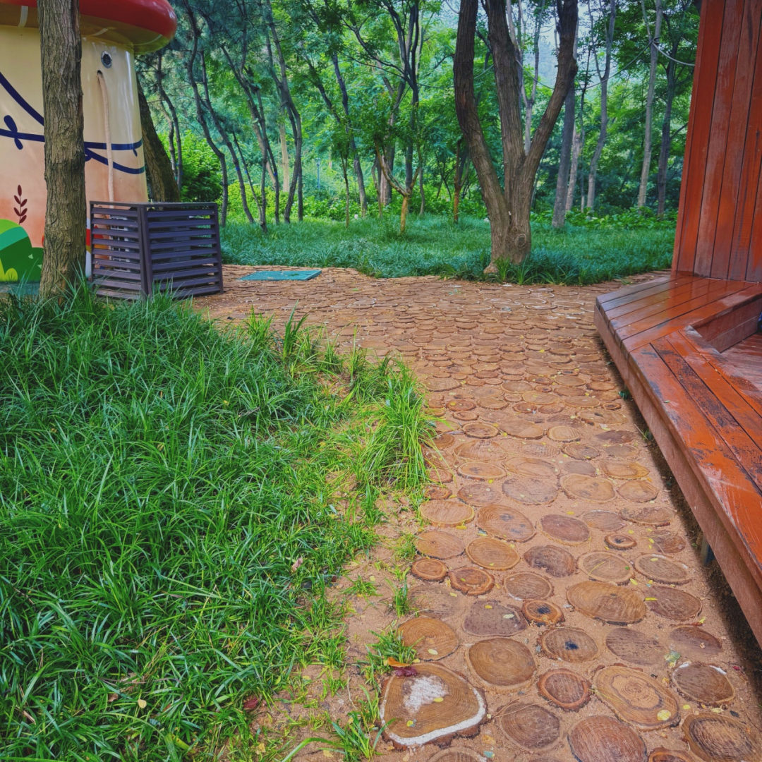 粗壮的废弃树干被锯成“年轮饼干”,一半埋进土里,一半露出地面。这些木桩就像大地的纽扣,结实地固定住松软的泥土。更有趣的是,每个切面都展示着独一无二的“树木密码”——深色的是干旱年,宽的是丰水季。小朋友最喜欢蹲在地上数"树龄",把散步变成了自然课。