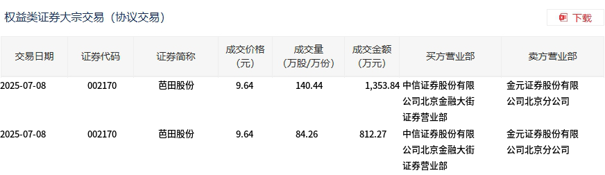 7月8日,芭田股份大宗交易成交224.7万股,成交额2166.11万元,占当日总成交额的4.76%,成交价9.64元,较市场收盘价11.03元折价12.6%。