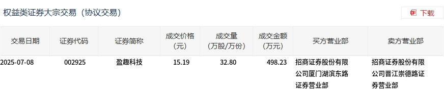 7月8日,盈趣科技大宗交易成交32.8万股,成交额498.23万元,占当日总成交额的4.62%,成交价15.19元,较市场收盘价16.88元折价10.01%。