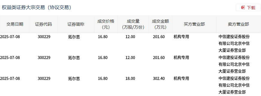 7月8日,拓尔思大宗交易成交42万股,成交额705.6万元,占当日总成交额的1.31%,成交价16.8元,较市场收盘价18.09元折价7.13%。