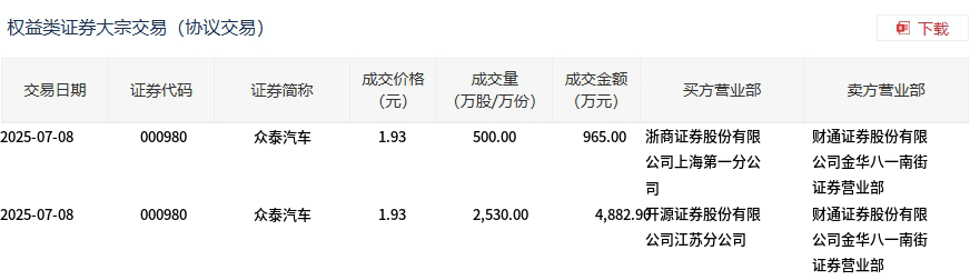 7月8日,众泰汽车大宗交易成交3030万股,成交额5847.9万元,占当日总成交额的20.45%,成交价1.93元,较市场收盘价2.07元折价6.76%。