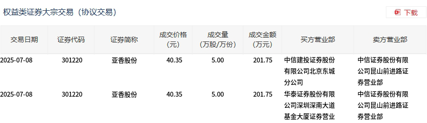 7月8日,亚香股份大宗交易成交10万股,成交额403.5万元,占当日总成交额的4.56%,成交价40.35元,较市场收盘价44.02元折价8.34%。