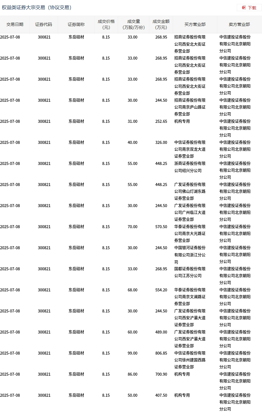 7月8日,东岳硅材大宗交易成交866万股,成交额7057.9万元,占当日总成交额的5.87%,成交价8.15元,较市场收盘价10.04元折价18.82%。