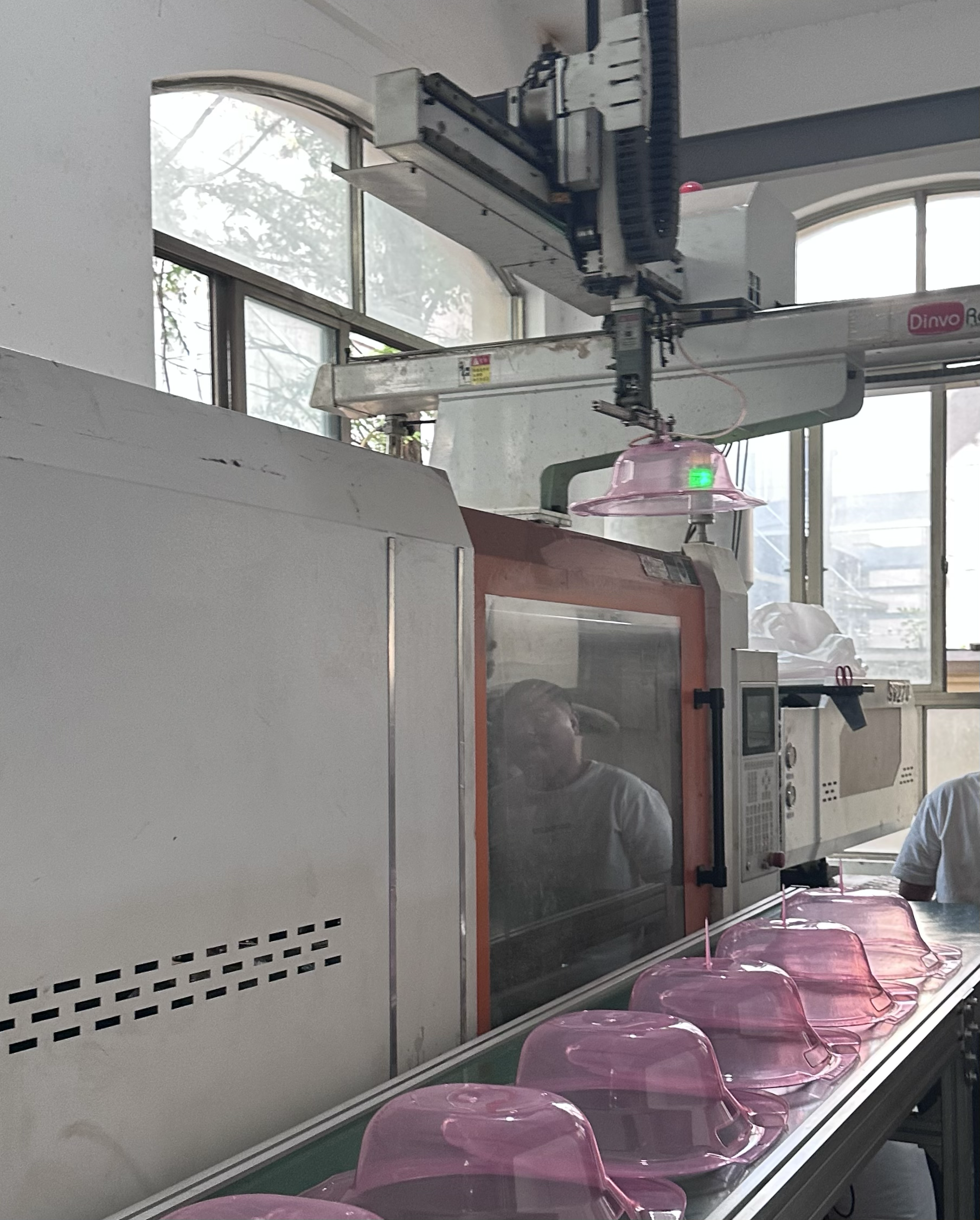 工作日的下午,义乌丁店村一座两千平米的工厂深处,一排注塑机轰隆作响,空气中有新塑料加热后的气味。一大袋粉色的pc颗粒灌入注塑机,仅需十来秒,就变成一个个带蝴蝶结形状的马桶坐浴盆,再由机械臂取走放置在传送带上,最终整齐地码在箱子里。