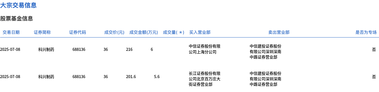 7月8日,科兴制药大宗交易成交11.6万股,成交额417.6万元,占当日总成交额的0.88%,成交价36元,较市场收盘价41.9元折价14.08%。