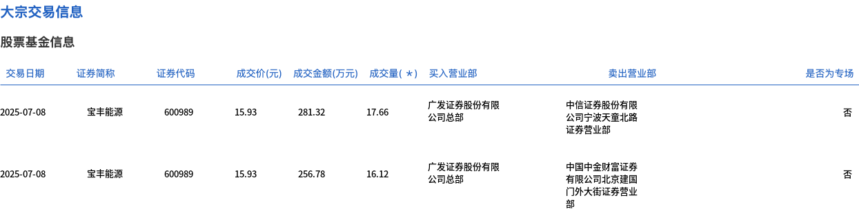 宝丰能源今日大宗交易平价成交33.78万股,成交额538.1万元