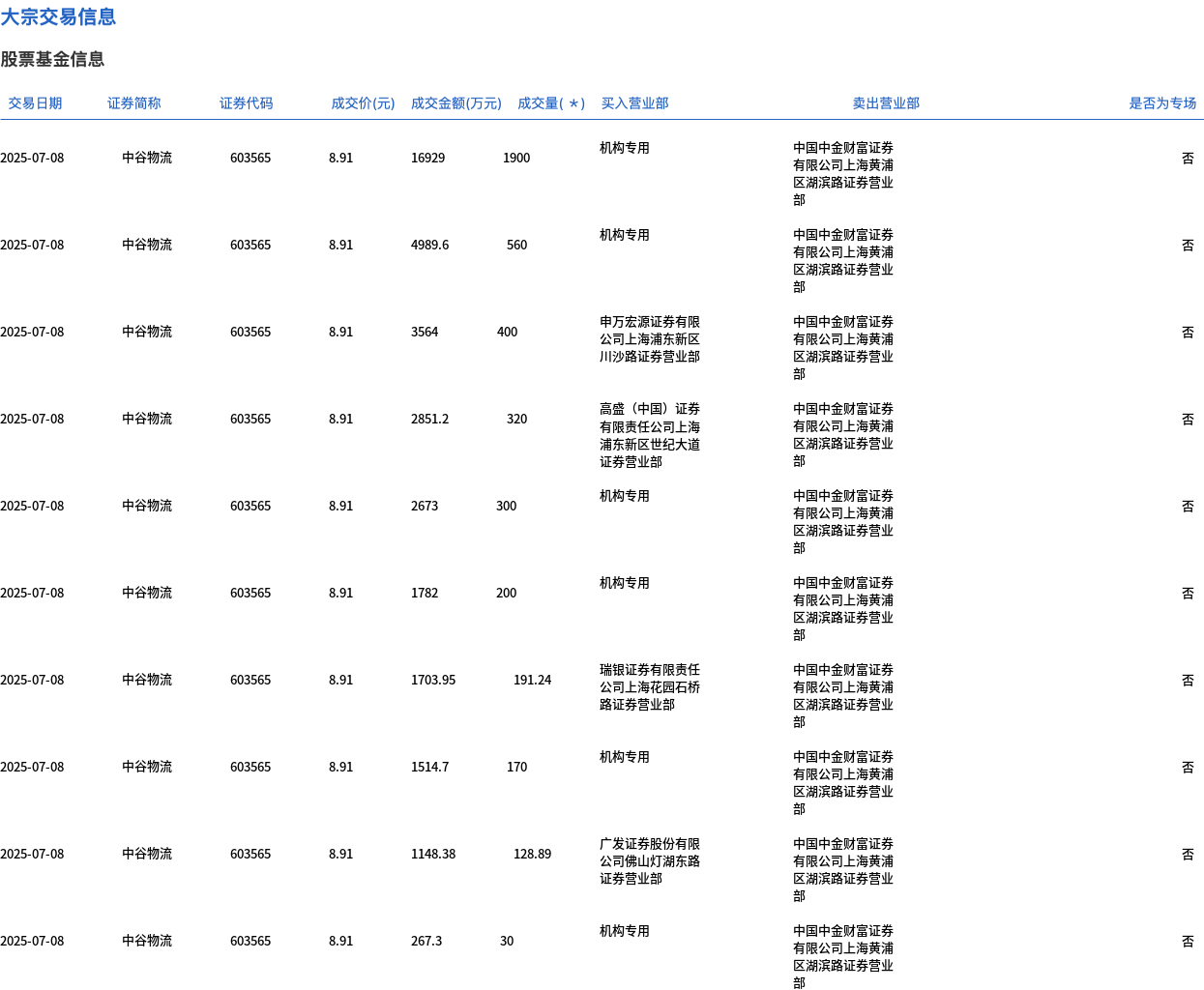 7月8日,中谷物流大宗交易成交4200.13万股,成交额3.74亿元,占当日总成交额的74.5%,成交价8.91元,较市场收盘价9.65元折价7.67%。