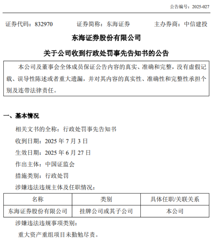 东海证券作为该起资产重组项目的财务顾问,也存在严重失职行为,证监会2023年2月对其进行立案调查。2025年7月3日,东海证券收到了证监会的行政处罚事先告知书。