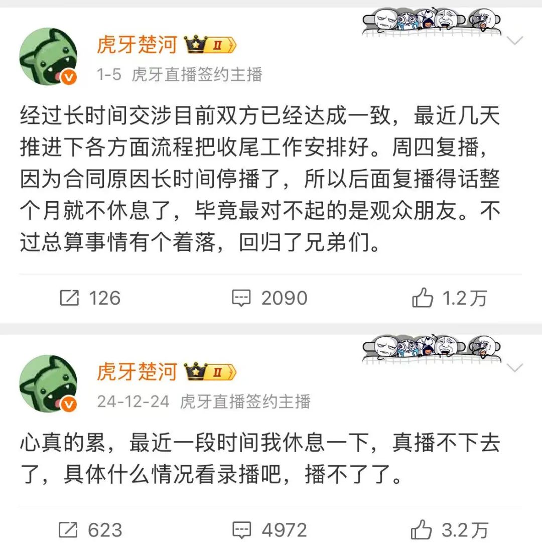 平台要留下主播并不容易,去年12月,虎牙头部游戏主播楚河宣布停播,截至其宣布停播之前,其在虎牙上拥有超900万粉丝。不过,随后楚河又表示双方已经达成一致,重新复播。