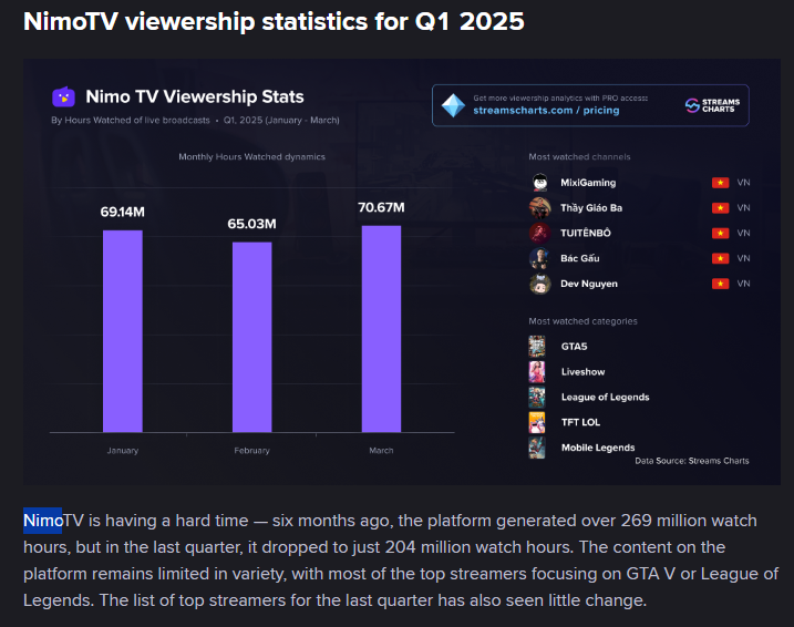 报告还专门对Nimo TV做了分析,称六个月前,Nimo TV的观看时长超过2.69亿小时,但在2025年第一季度,这个数据下降到了只有2.04亿小时。报告认为,Nimo TV上的内容种类仍然有限,大多数顶级主播都专注于GTA V或英雄联盟,顶级主播名单也几乎没有变化。