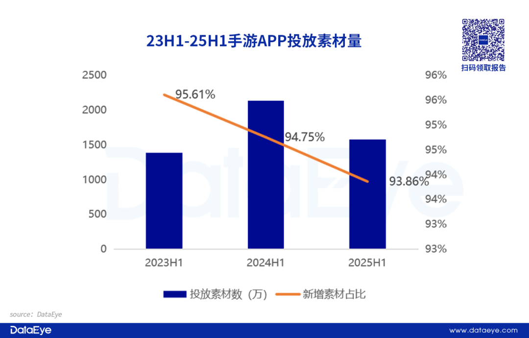 新增素材方面,2025上半年新增投放素材占比总投放素材约93%,也是近3年来占比最低的一年,意味着更多素材被重复利用。