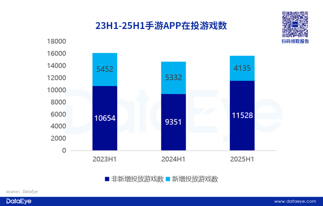 2025上半年在投游戏数超过1.5万款,同比增长超过6.6%。国内手游APP在投游戏数回暖,但仍低于2023年同期。