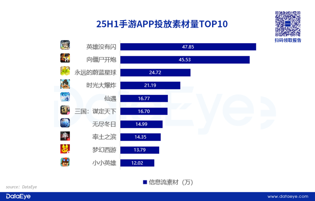 从中重度手游APP投放榜情况来看,《英雄没有闪》登顶,头部投放产品换血75%。《英雄没有闪》《向僵尸开炮》以及《永远的蔚蓝星球》排名中重度投放榜TOP3。其中,《英雄没有闪》和《向僵尸开炮》上半年总投放量超过45万。