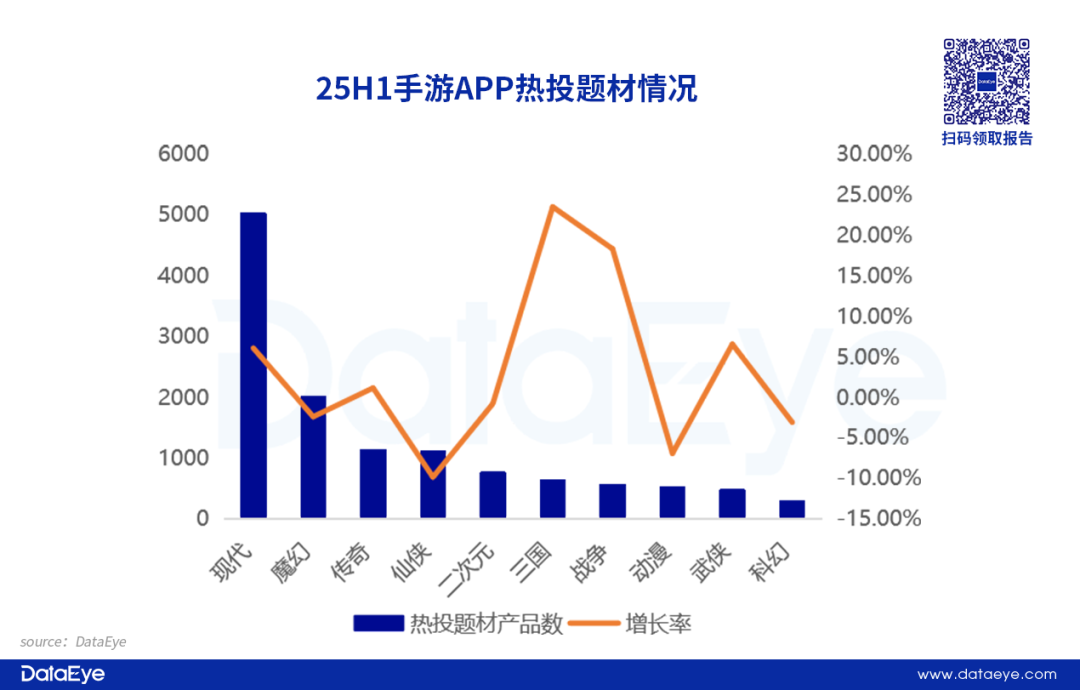从投放题材来看,现代题材投放数新高,三国、战争同比增长12%。现代题材产品在2025上半年投放游戏数超过5000款,同比增长约6%,依然保持强势。
