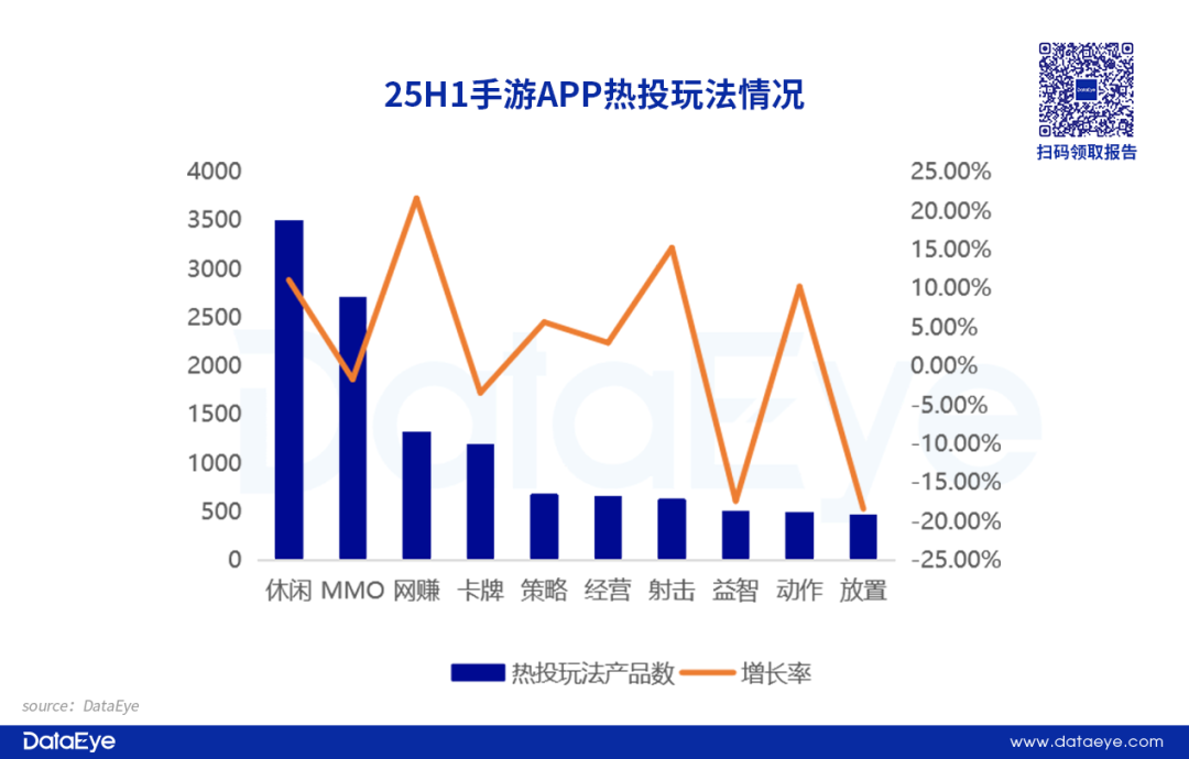 从投放玩法来看,MMO投放游戏数继续下滑,网赚同比增长明显。2025上半年休闲玩法投放游戏数接近3500款,同比增长超过11%。轻度休闲产品依然有大量产品入局买量,但可玩性相对较低的益智类产品投放游戏数下滑明显,同比减少了约100款。