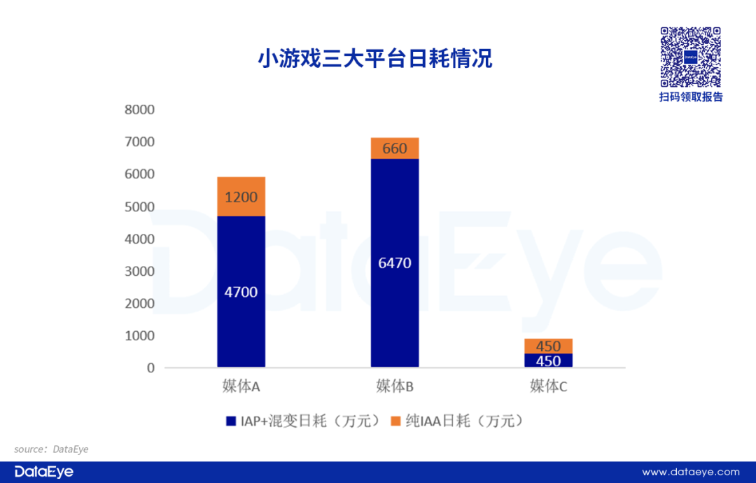 从日耗数据来看,小游戏直投买量日耗1.39亿,纯IAA小游戏占16%。目前三大媒体平台,小游戏买量日耗约1.39亿,而春节期间(1月)约1.7亿。IAA日耗约2310万,在三大主要广告平台直投分别为1200万、660万、450万。