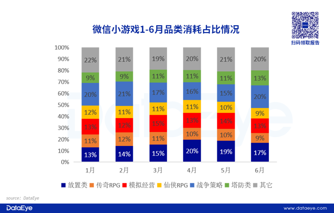 从微信小游戏品类消耗占比来看,放置塔防消耗占比提升,策略类先降后升。放置品类和塔防品类的消耗占比在上半年呈现持续提升态势。其中,放置品类从占比13%一度升至20%,而塔防品类在6月占比达到13%。