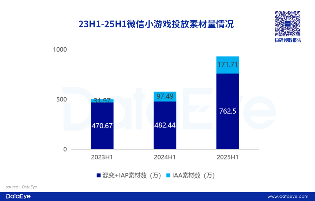 从投放素材量来看,微小投放素材量创新高。2025上半年微信小游戏投放素材量再创新高,同比增长超过60%。其中IAA投放素材量接近翻盘,而IAP+混变投放素材量呈现出较高的增长,同比增长58%。