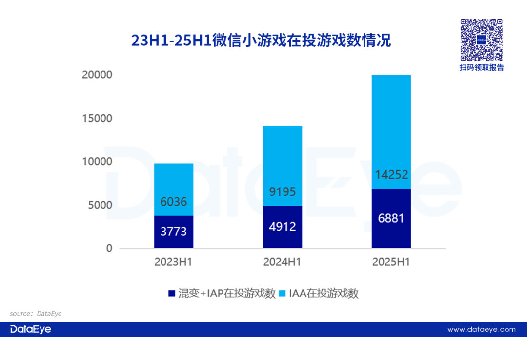 从投放游戏数来看,在投微小游戏超过2.1万款。2025上半年在投微信小游戏数突破2.1万款产品,再创历史新高,同比增长49%。其中,IAA小游同比增长明显,体现出IAA小游戏开发周期短、研发技术门槛低等优势,相关产品可以快速立项上线投放获量。