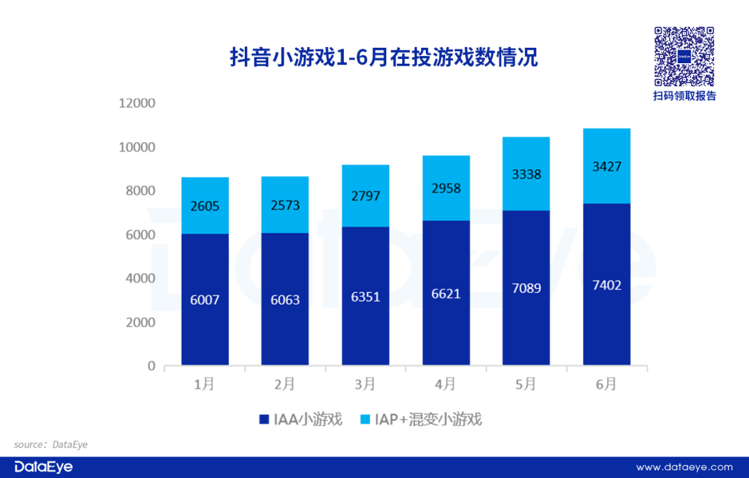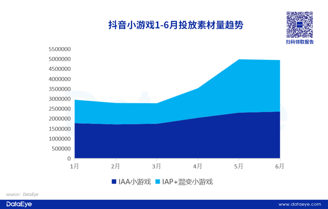 其中,5月混变+IAP小游戏投放量超过267万条,带动大盘投放量提升。整体来看,IAA小游戏依然是抖音的主力,但相关素材占比大盘的比例持续下滑,6月占比下滑至46%。
