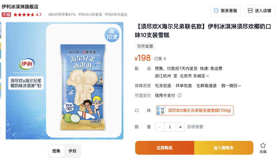 7月9日,伊利集团旗下冰淇淋品牌须尽欢与海尔集团共同宣布,须尽欢×海尔兄弟联名冰淇淋全网上线。伊利冰淇淋旗舰店显示,该产品10支装售价198元。