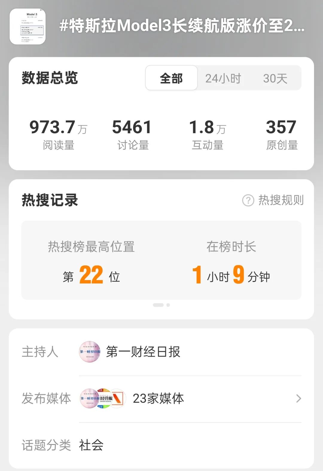 放在两年前,特斯拉价格调整是行业的头等大事,但如今,这条新闻在微博热搜榜上只撑了 1 小时 9 分钟。