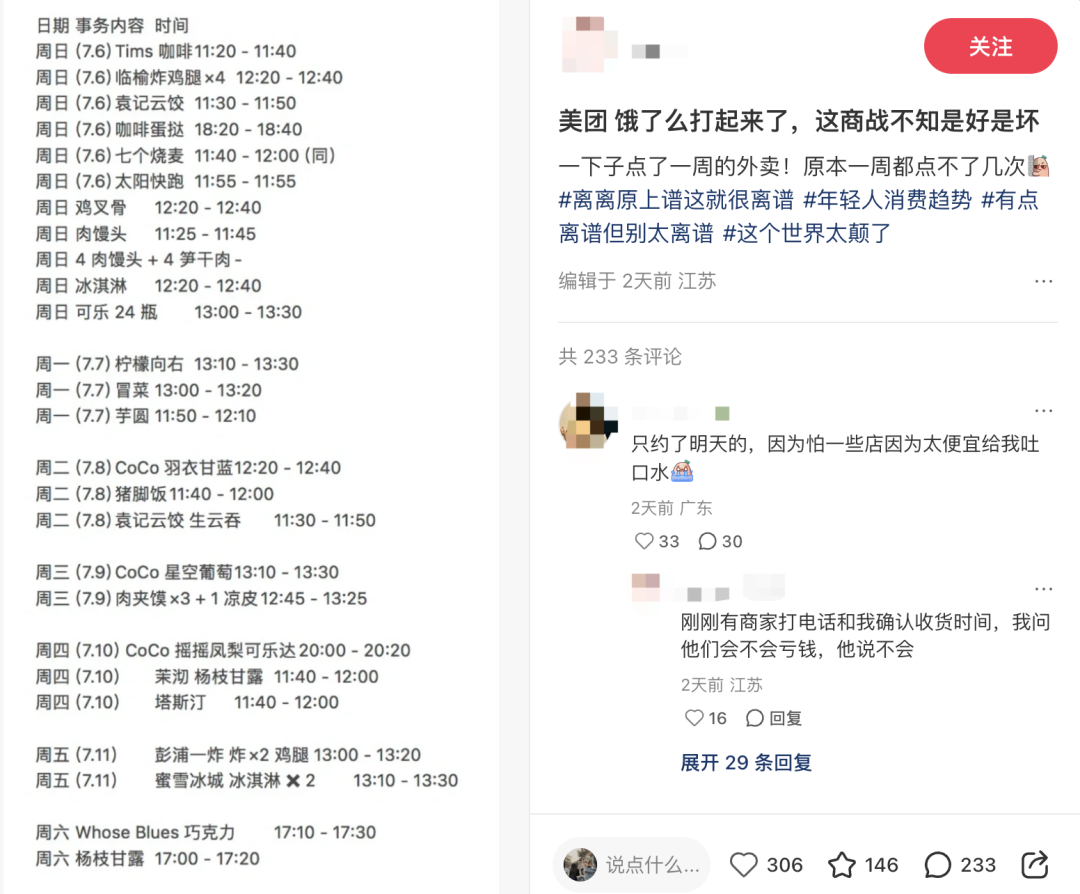 有抢到多张优惠券的消费者,晒出了一周外卖订单,“一下子点了一周的外卖,原本一周点不了几杯”。