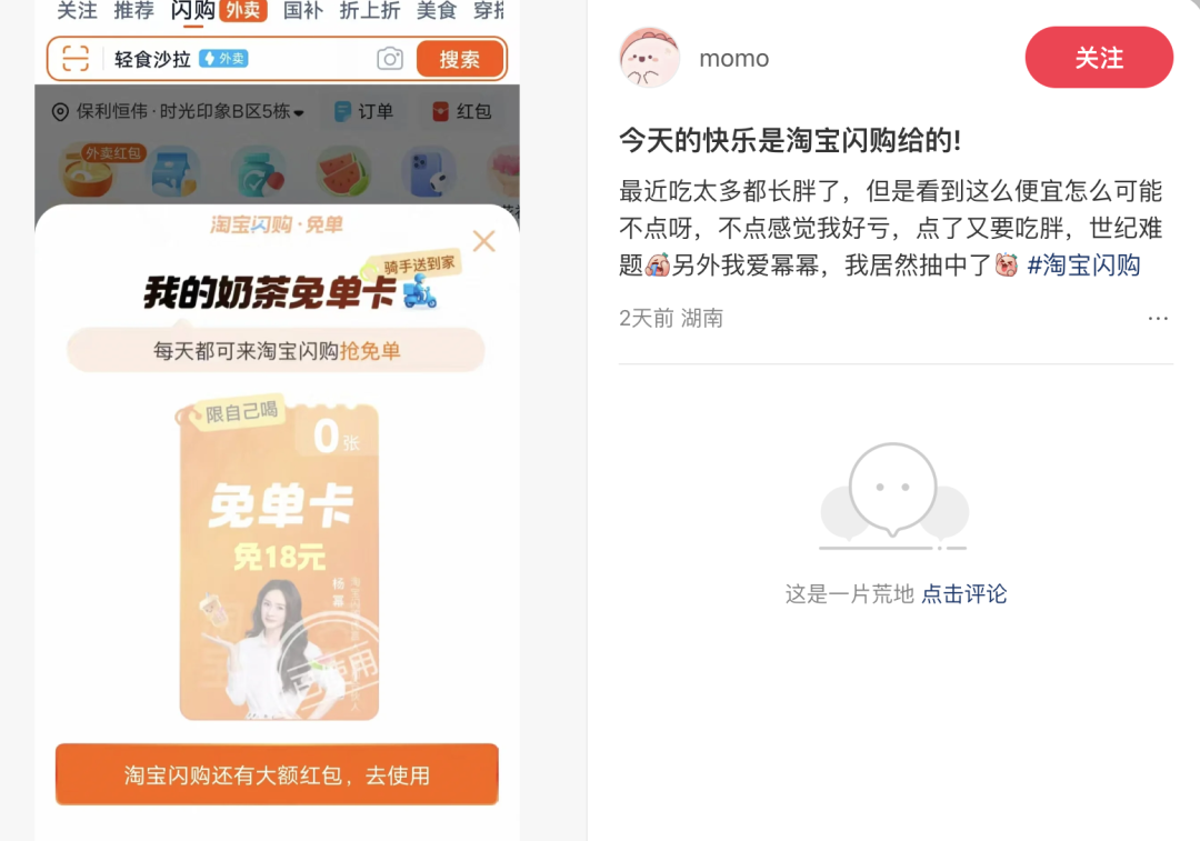 #美团APP陷入瘫痪的话题一度登上微博热搜,这场外卖大战引发的全民参与度更是空前高涨。在社交媒体平台和各大社群中,关于如何薅羊毛的讨论声此起彼伏,用户端自发攻略分享、晒单、玩梗,共同将这场战事托举到next level。
