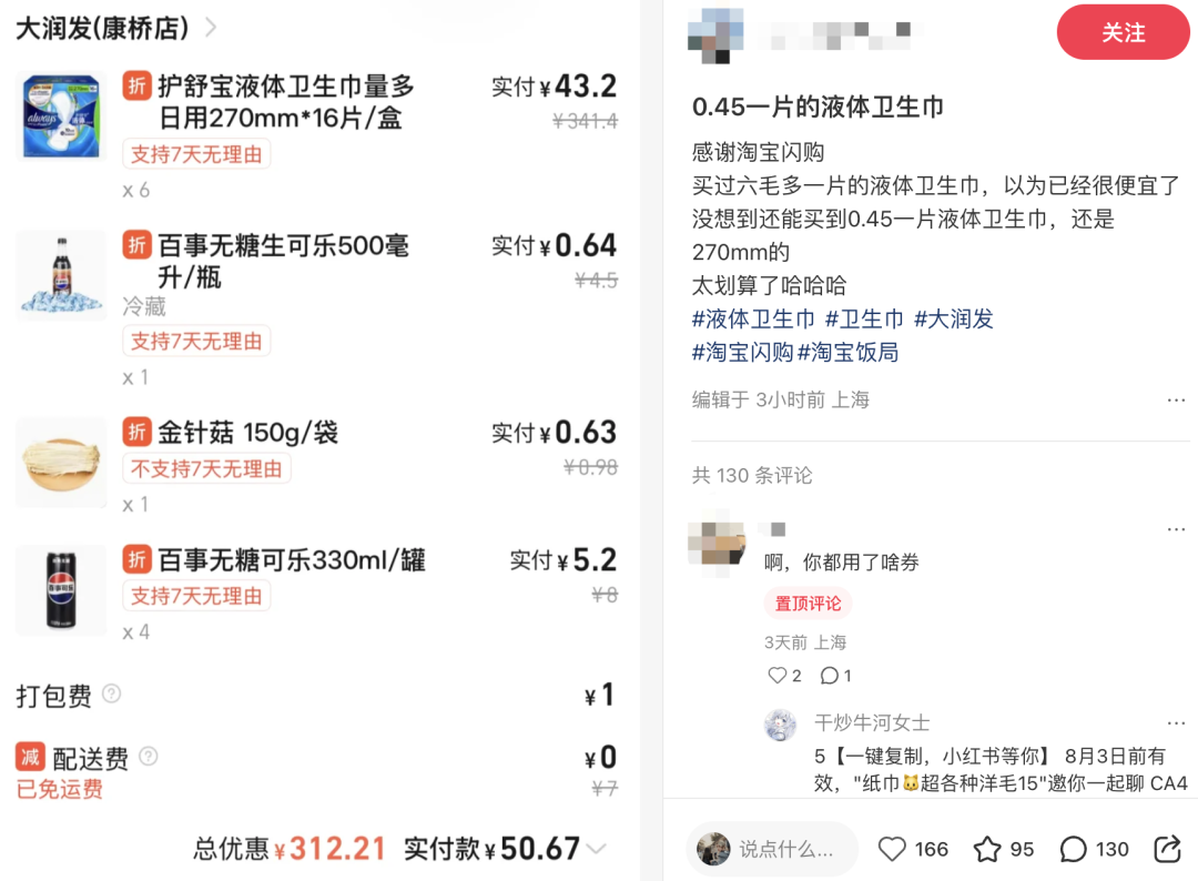 有消费者在淘宝闪购上购买到了低至0.45元一片的液体卫生巾后,在社交媒体上发帖感叹。