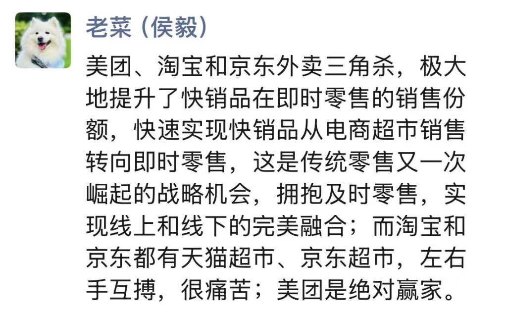 美团、淘宝和京东外卖三角杀,一方面极大提升了快消品在即时零售的销售份额,快速实现快消品从电商超市销售转向即时零售,是传统零售又一次崛起的战略机会。近日,盒马创始人侯毅在朋友圈点评道,“淘宝和京东都有天猫超市、京东超市,左右手互博,很痛苦;美团是绝对赢家。”