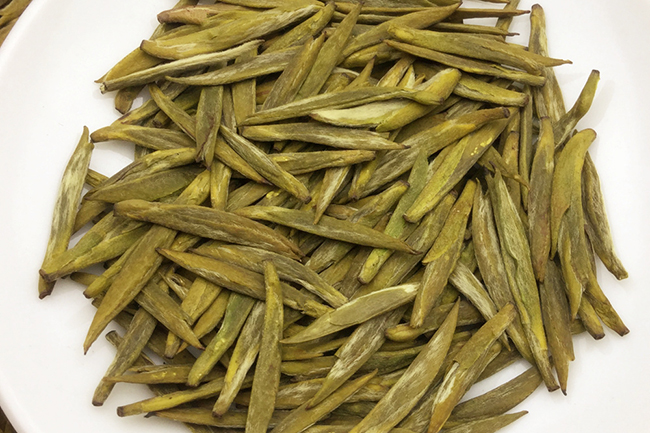 君山银针属黄茶类,以色、香、味、形俱佳而著称。银针茶在茶树刚冒出一个芽头时采摘,经十几道工序制成。其成品茶芽头茁壮,长短大小均匀,内呈橙黄色,外裹一层白毫,故得雅号“金镶玉”,又因茶芽外形很像一根根银针,故名君山银针。