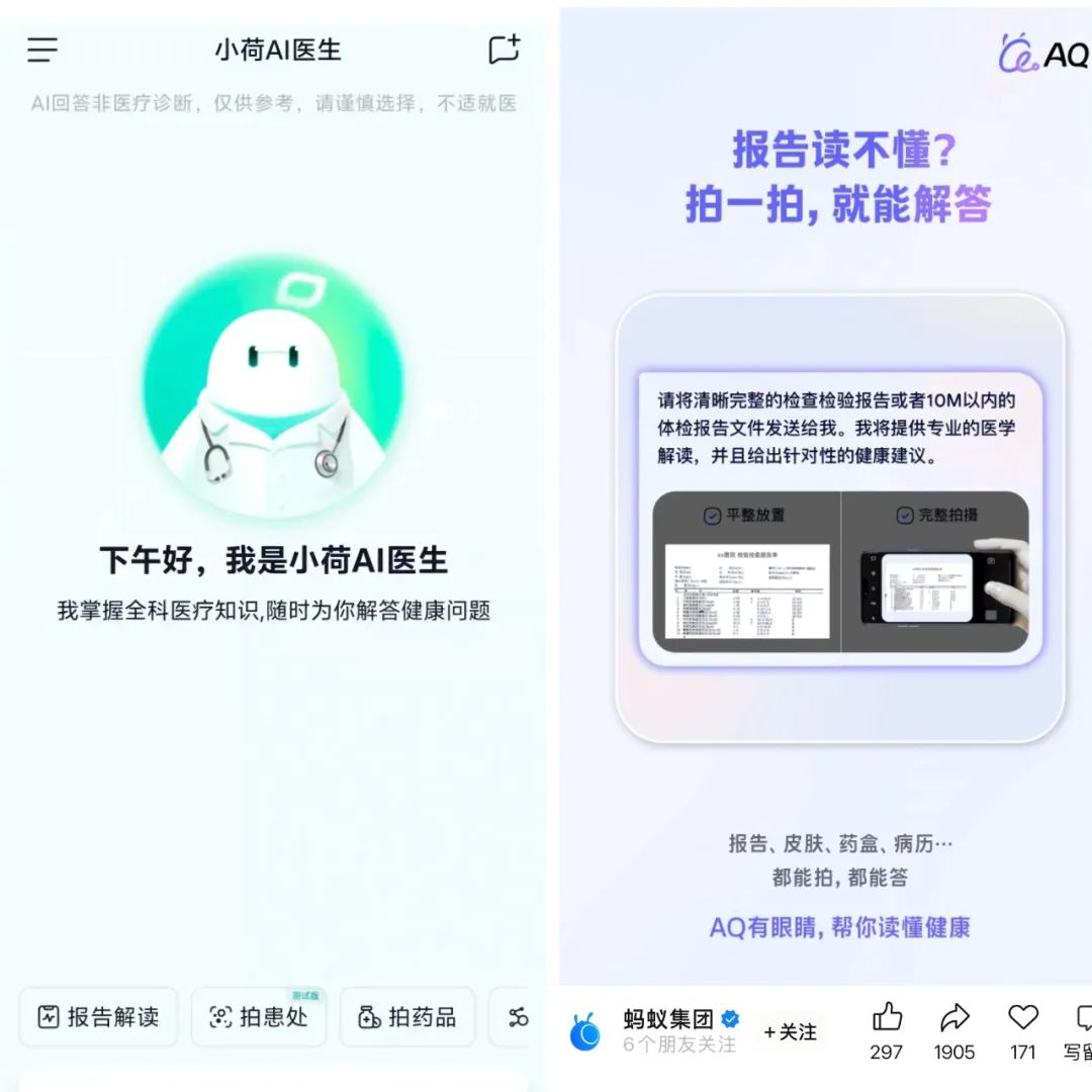 在C端AI医疗上,字节在近期推出的独立App「小荷AI医生」、蚂蚁集团的AI健康助手App「AQ」、京东的「AI京医」,就连美团买药也推出了健康助手功能。