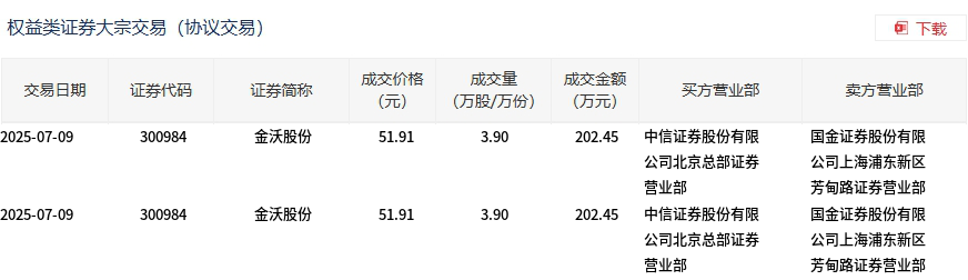 7月9日,金沃股份大宗交易成交7.8万股,成交额404.9万元,占当日总成交额的2.89%,成交价51.91元,较市场收盘价52.97元折价2%。
