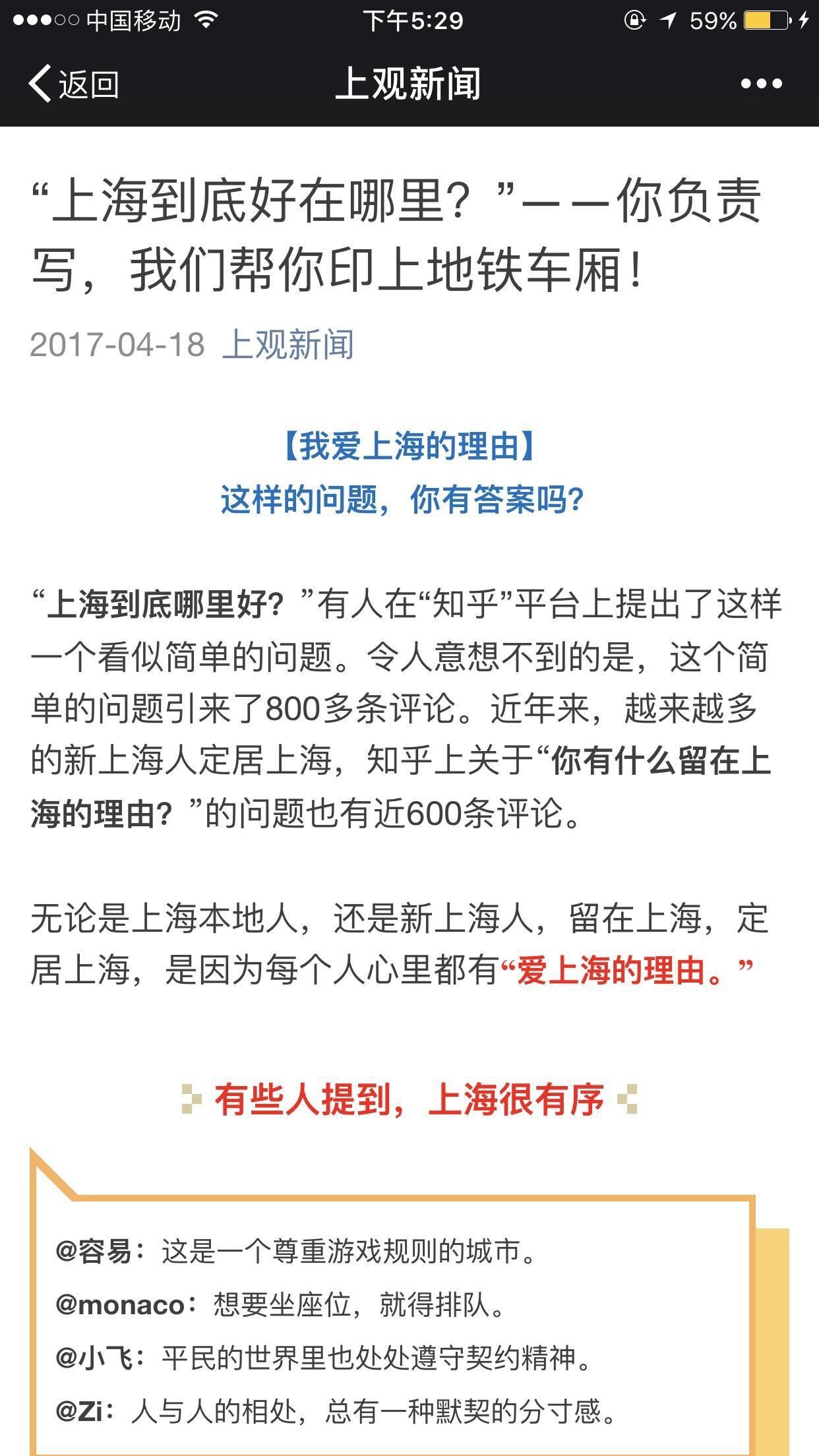 两周前,上观新闻和上海地铁在各自的社交媒体平台上发布了“爱上海的理由”网友征集令。征集令一出,在上海本地社交媒体上形成了强烈的转发热潮。