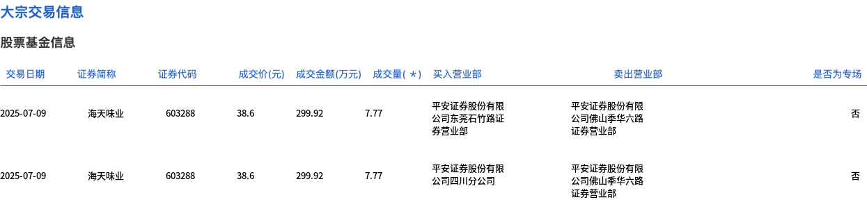 7月9日,海天味业大宗交易成交15.54万股,成交额599.84万元,占当日总成交额的1.09%,成交价38.6元,较市场收盘价38.6元持平。