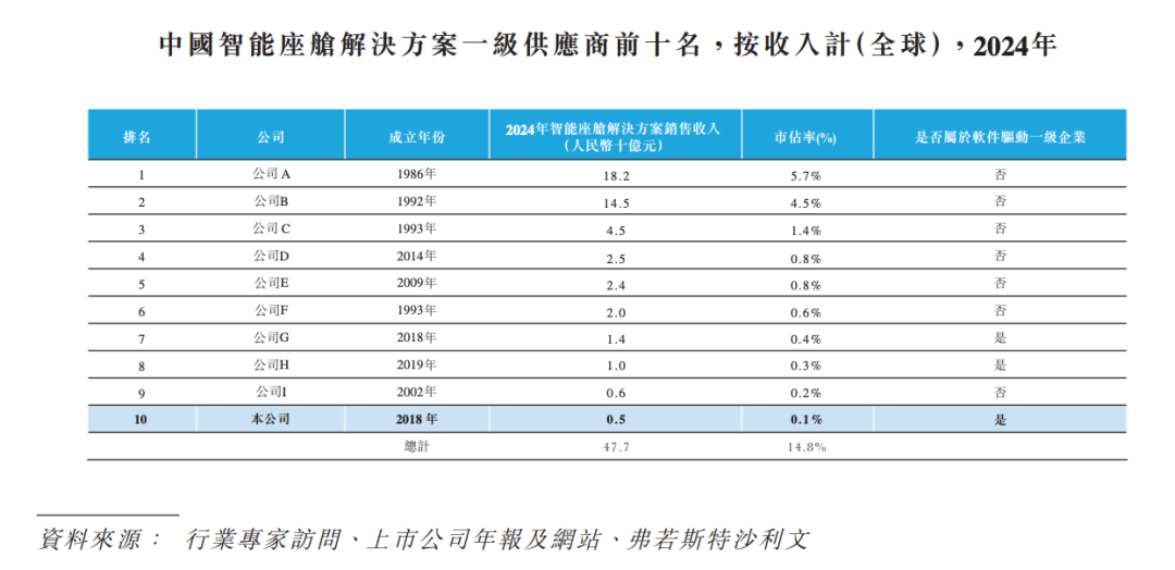 2024年,四维智联在1300亿元的智能座舱市场中,只分到0.1%的份额,行业前三(市占率分别为5.7%、4.5%、1.4%)的体量是它的十几倍甚至将近60倍。