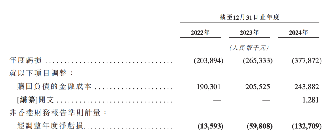 即使剔除上市前融资的特殊会计准则影响,反映真实经营状况的经调整净亏损,也从2022年的1359万元,扩大至2024年的1.33亿元,三年间涨了超十倍。