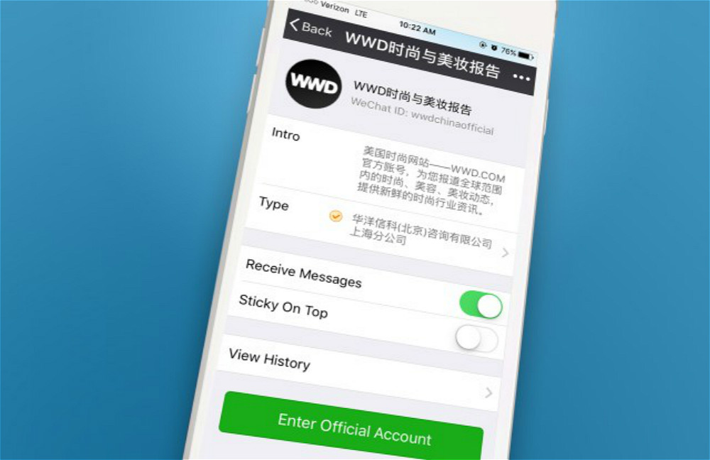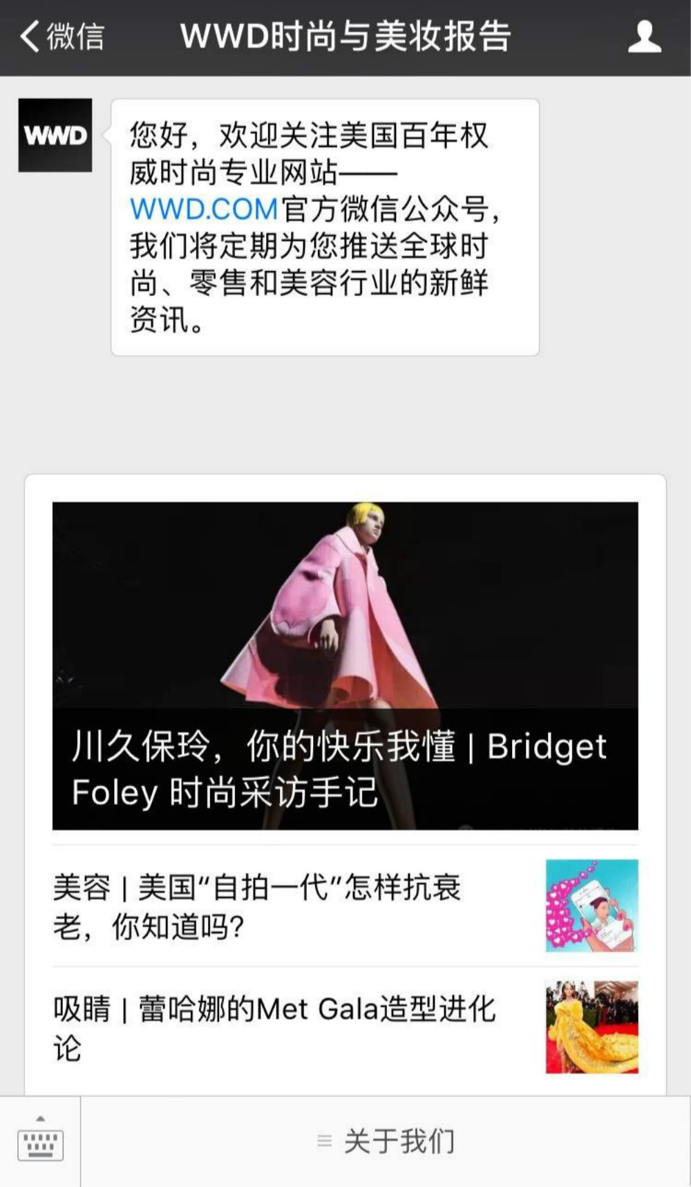 “我们建立这个账号是为了未来拓展中国业务,并用中国读者喜欢的方式加强和他们的连接。我们的微信号可以链接WWD.com,每天有100多条英文新闻。”WWD对界面说。