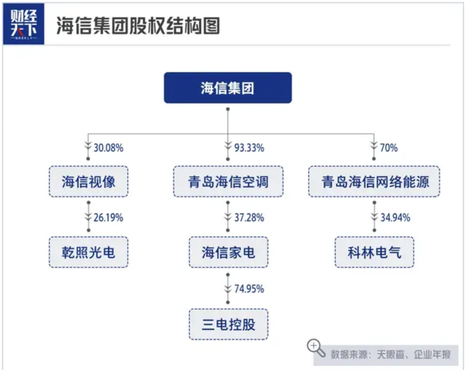 海信家电背靠的海信集团控股股份有限公司(以下简称“海信集团”),是一个营收超2000亿元的巨无霸。后者旗下,拥有海信家电、海信视像、三电控股、乾照光电、科林电气5家上市公司,业务范围遍及全球。其中海信视像主攻显示终端,海信家电主营业务以暖通空调、冰洗、厨电为主,共同成为集团的两大支柱。