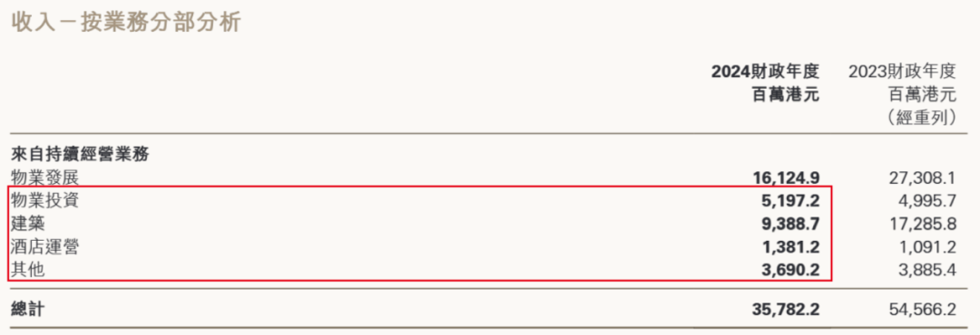 而新世界发展能够更快获得金融机构的支持,与其资产更为多元化有一定关系。相比于更专注于住宅开发的房企,新世界发展的资产包相对更均衡,酒店、物业投资、建筑等业务更为成熟,这些业务在2024财年贡献的收入在13亿港元至94亿港元之间,形成更稳定的现金流。