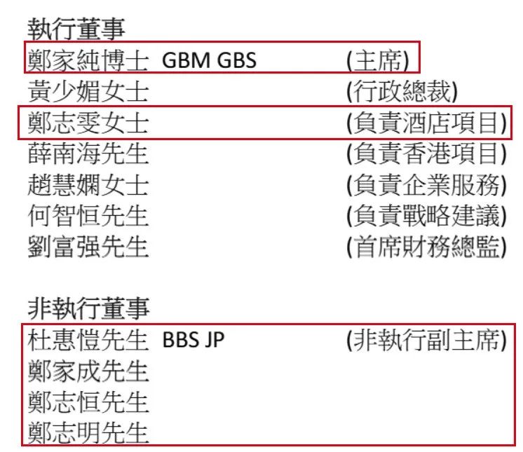 在郑志刚辞任之后,除父亲郑家纯、叔叔郑家成、姑丈杜惠恺仍在董事会之外,郑志刚的兄弟姐妹也已经占据一席之地。其中,郑志刚的妹妹郑志雯担任执行董事,负责酒店项目;堂兄郑志恒、胞弟郑志明则出任非执行董事。