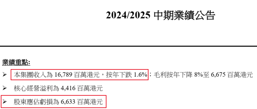 在2025财年上半年,新世界发展业绩再度下挫。其中,收入同比下滑1.6%至167.89亿港元,股东应占亏损为66.33亿港元。