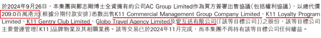 同年9月,公司将5家主要营运管理K11品牌物业及相关业务的子公司,转让予郑志刚全资拥有的公司,回笼资金2.09亿港元。