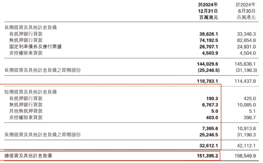 截至2024年12月31日,其总借贷及其他计息负债高达1514亿港元,其中一年内到期的借贷、计息负债为326亿港元。