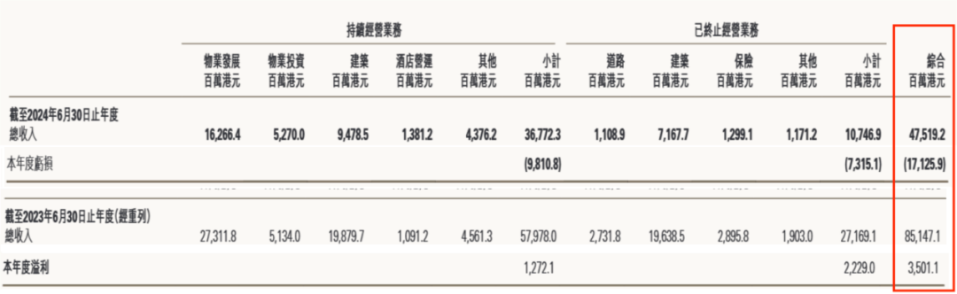 2024财年,其实现总收入475.19亿港元,同比下滑44%;利润由盈转亏,总亏损额高达171.26亿港元,这是近20个财年以来新世界发展首次出现亏损。