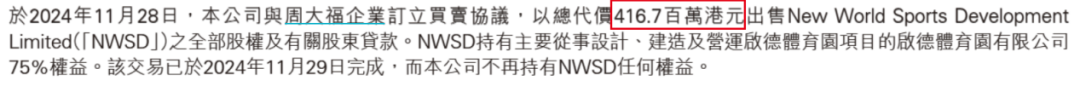 2个月后(11月),公司又将启德体育园项目75%股权转让予周大福企业,总代价4.167亿港元。
