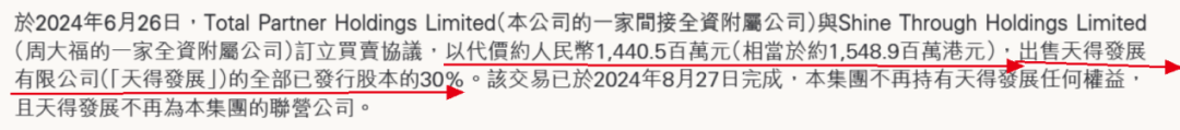 2024年6月,新世界发展间接全资附属公司Total Partner Holdings Limited将天得发展30%股权,出售予周大福的全资子公司,回笼资金人民币14.405亿元(相当于约15.49亿港元)。