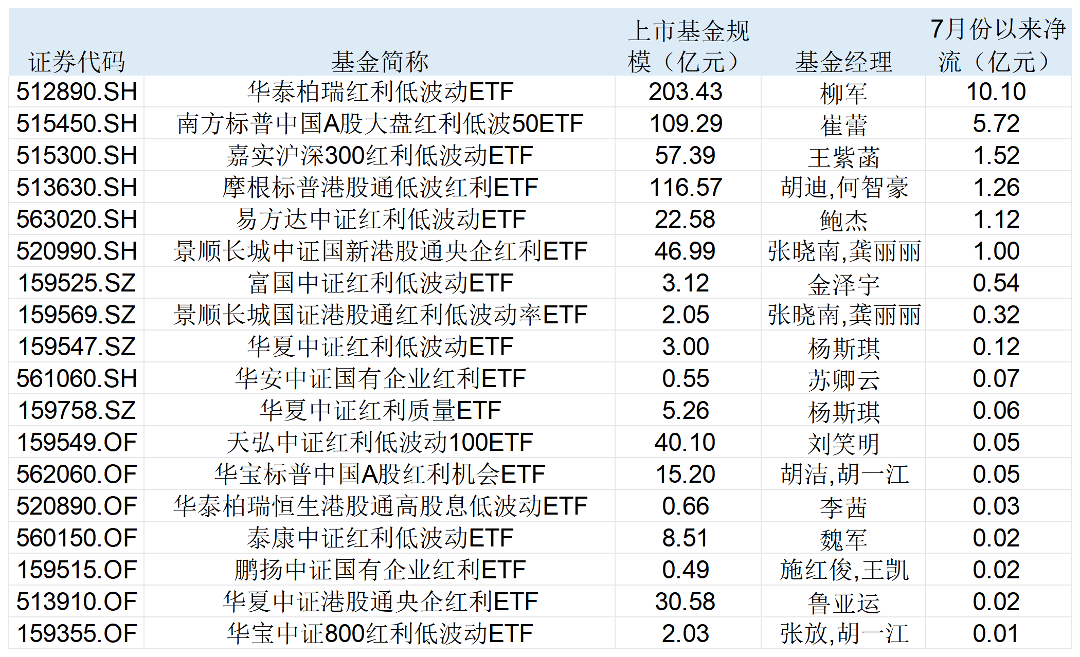 以银行股为代表的高股息红利资产受到资金的追捧。Wind数据显示,7月份以来,多只红利ETF资金呈现净流入的态势。其中,华泰柏瑞红利低波动ETF(512890.SH)7月份资金净流入10.1亿元,截至7月10日收盘,规模达到了203.43亿元;南方标普中国A股大盘红利低波50ETF(515450.SH)7月份以来净流入5.72亿元,最新规模达到了109.29亿元。