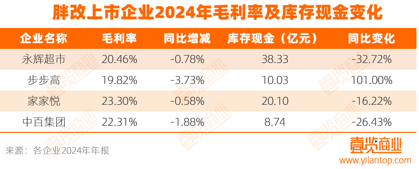 首先,营收与利润背道而驰。从2024年年报看,除步步高因引入投资人,募集25亿重整资金(非经常性重整收益)而实现账面扭亏外,其余企业业绩普遍恶化。永辉超市与中百集团营收、净利润双双下滑,家家悦则呈现“增收不增利”特征。